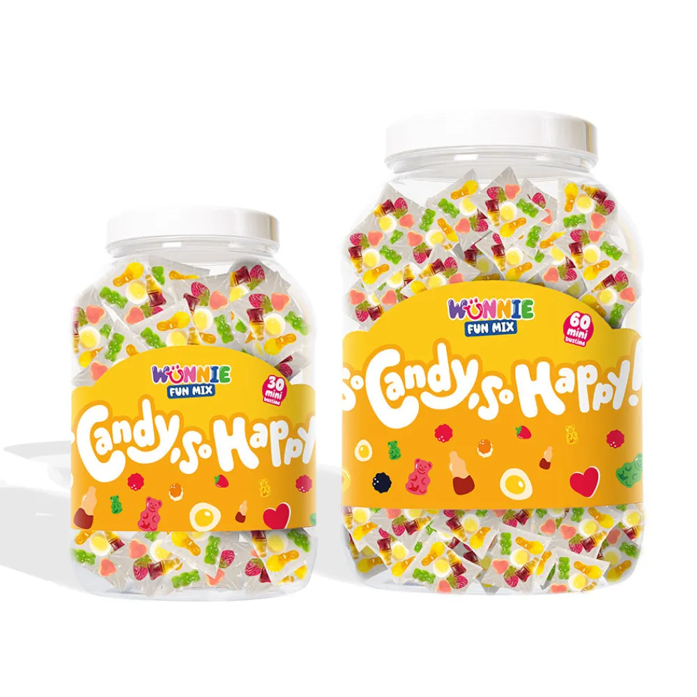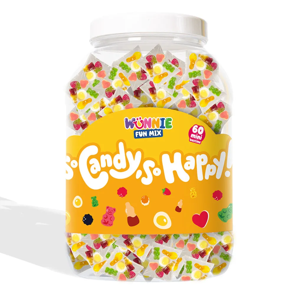 Wunnie Fun Mix Γ¨ il barattolo che trasforma ogni momento in una festa: 30 o 60 bustine monoporzione di caramelle gommose dai gusti piΓΉ pazzi e colorati del pianeta. Pratiche, igieniche e perfette per premiare, condividere, distribuire (e nascondere nellβultimo cassetto della scrivania). Aggiungilo al carrello oggi stesso!