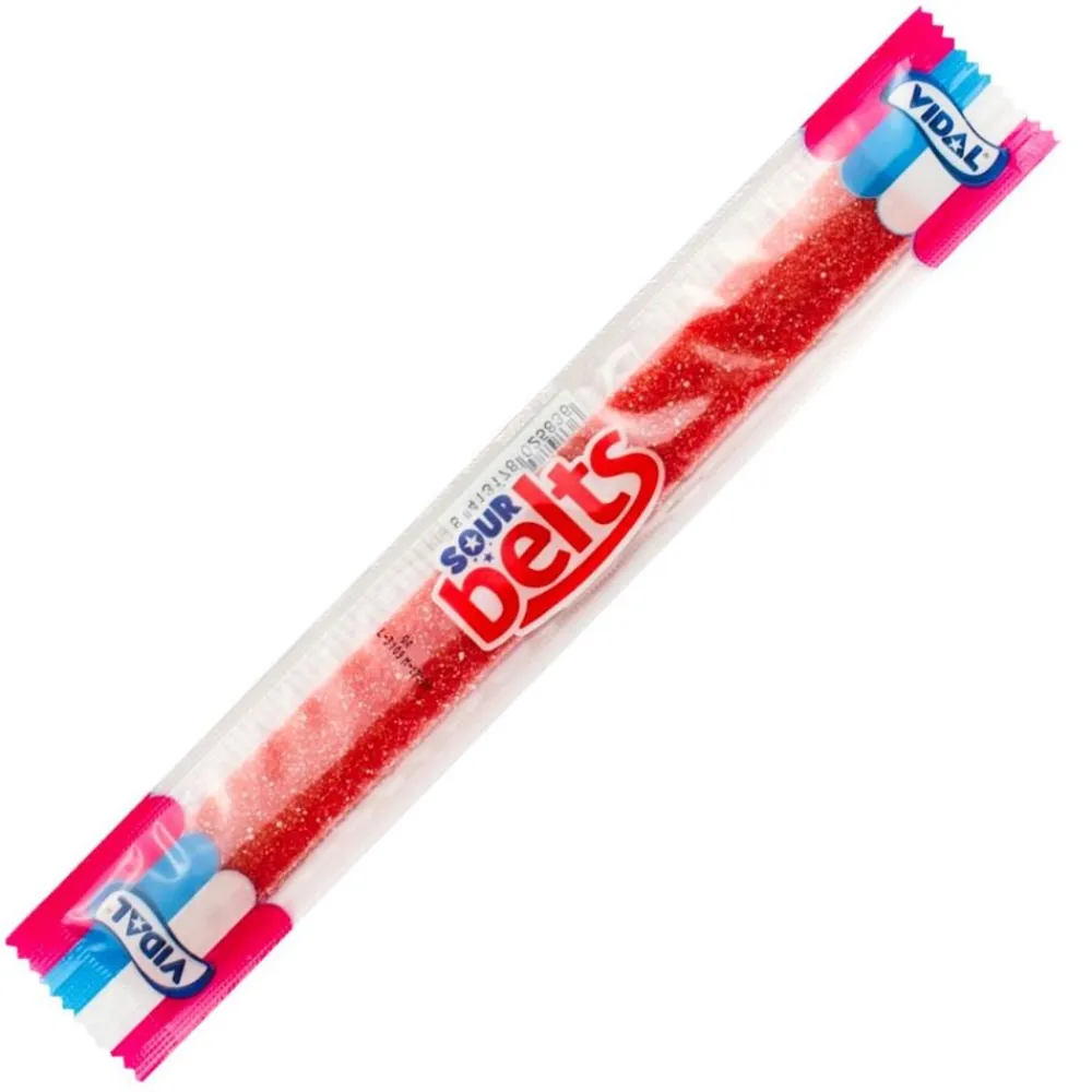 Vidal Sour Belts Strawberry, caramella al gusto aspro di fragola da 9g su AmericanUncle