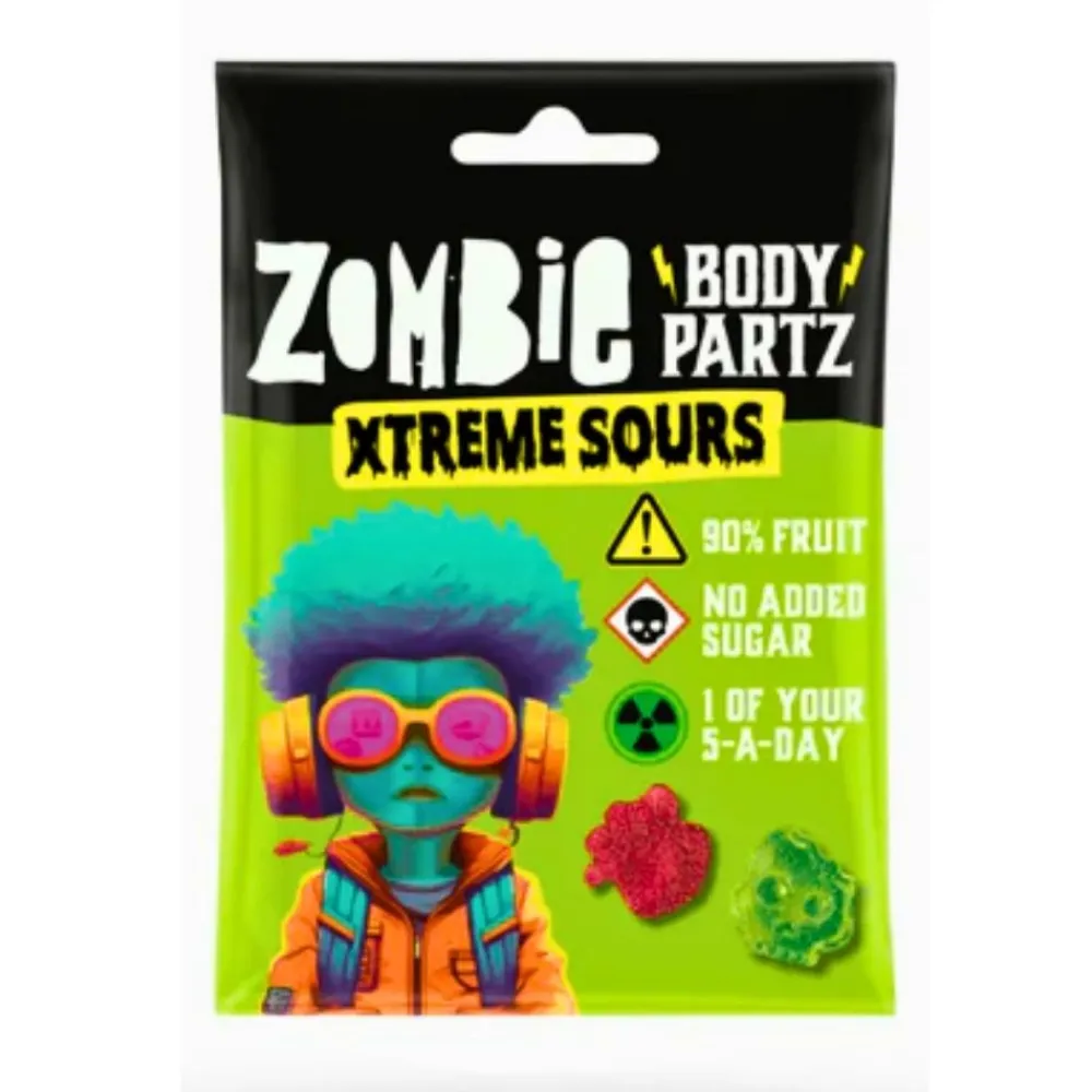 Confezione da 100g di Zombie Body Partz Xtreme Sours, caramelle gommose alla frutta per i palati più coraggiosi. Queste caramelle non solo delizieranno il tuo amore per i sapori fruttati, ma ti sorprenderanno con un’esplosione di asprezza estrema. Realizzate con succo di frutta concentrato, portano ogni boccone a un livello completamente nuovo di intensità. Sei pronto a mettere alla prova le tue papille gustative?