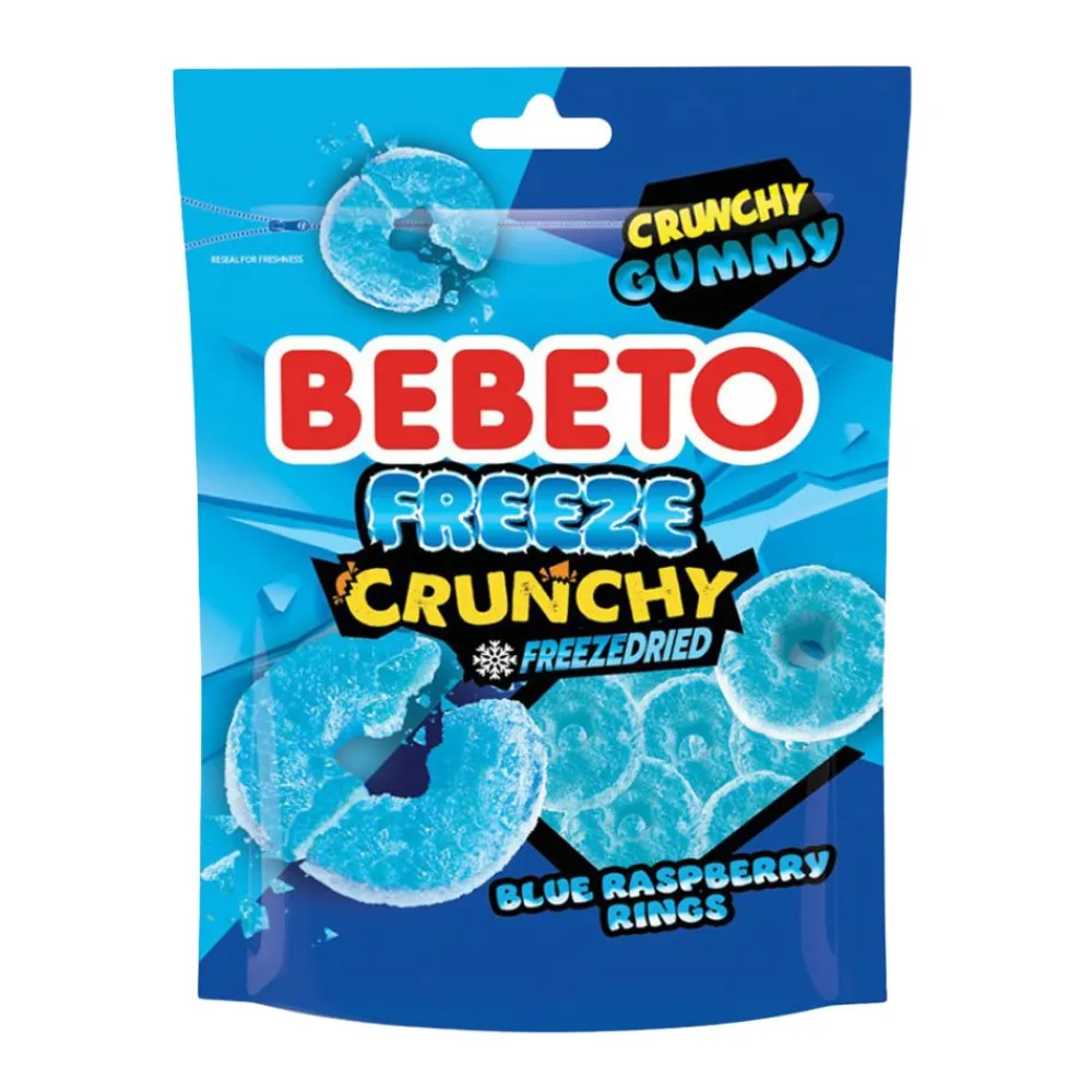 Confezione di Bebeto Freeze Crunchy Gummy Freezedried Blue Raspberry Rings, deliziose caramelle liofilizzate al gusto lampone. Queste caramelle offrono un’esperienza sensoriale unica grazie alla loro consistenza croccante e al sapore intenso di lampone blu. I Bebeto Freeze Crunchy Gummy sono perfetti per chi cerca uno snack diverso dal solito, combinando il piacere della gommosità con la leggerezza della liofilizzazione. Provale subito e lasciati sorprendere dalla loro bontà!