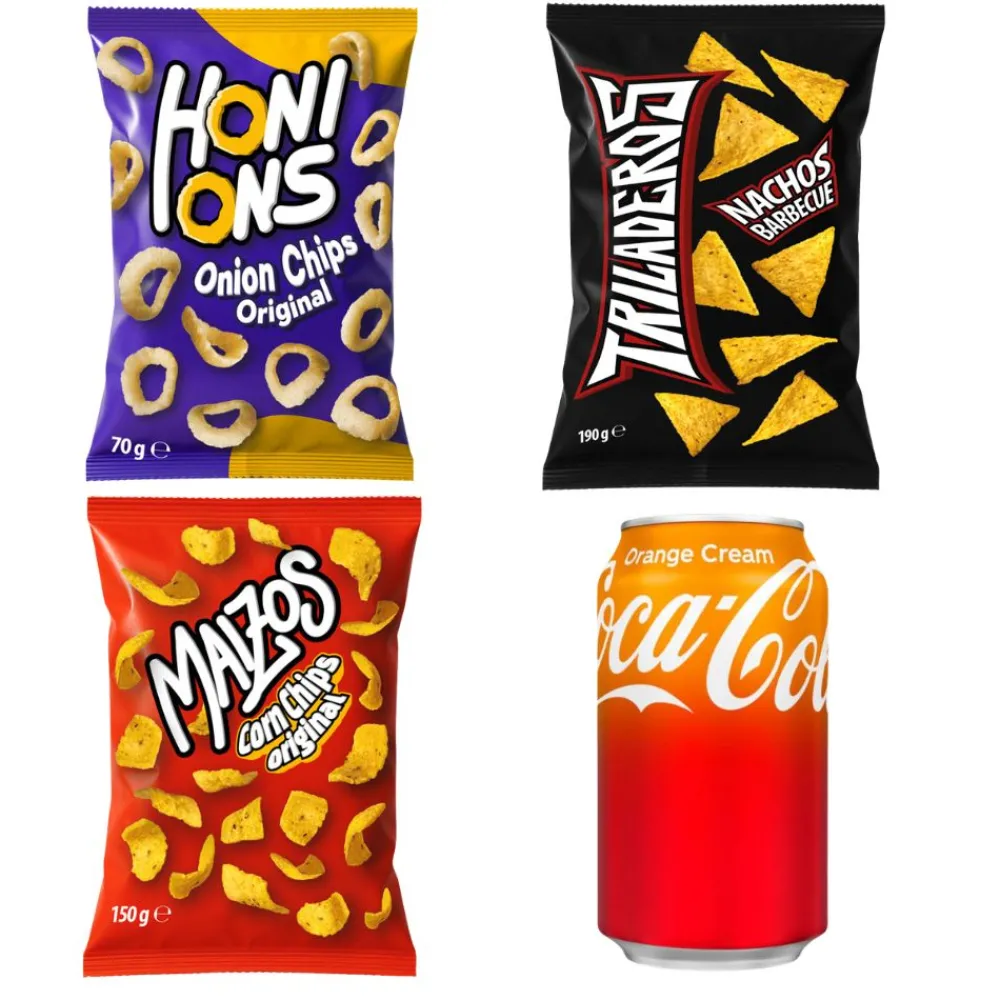 Lasciati travolgere dalla croccantezza irresistibile degli Honions, anelli di cipolla dorati che profumano di felicità. Affonda la mano nel sacchetto dei Maizos, le saporitissime corn chips che creano dipendenza. Scopri il carattere deciso dei Triladeros BBQ, nachos dal gusto affumicato e intenso, capaci di accendere ogni pausa. Per rinfrescare il palato tra un morso e l’altro, lasciati sorprendere dalla Coca Cola Orange Cream: la bevanda gassata che unisce il gusto iconico di Coca Cola alla dolcezza vellutata della crema all’arancia. Una combo frizzante, nuova, travolgente!