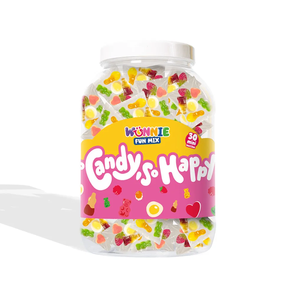 Wunnie Fun Mix Γ¨ il barattolo che trasforma ogni momento in una festa: 30 o 60 bustine monoporzione di caramelle gommose dai gusti piΓΉ pazzi e colorati del pianeta. Pratiche, igieniche e perfette per premiare, condividere, distribuire (e nascondere nellβultimo cassetto della scrivania). Aggiungilo al carrello oggi stesso!