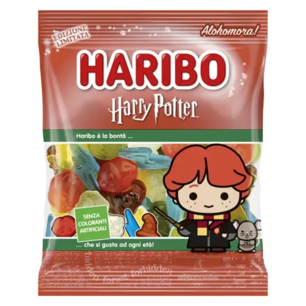 Confezione da 160g di Haribo Ron Edizione Limitata, caramelle gommose che combinano il gusto fruttato con il sapore classico della cola. Queste caramelle, create per i veri fan di Harry Potter, presentano forme ispirate agli oggetti e ai personaggi iconici della celebre saga. Un modo magico per gustare dolci momenti di piacere: prova subito la straordinaria edizione limitata dedicata a Ron Weasley!