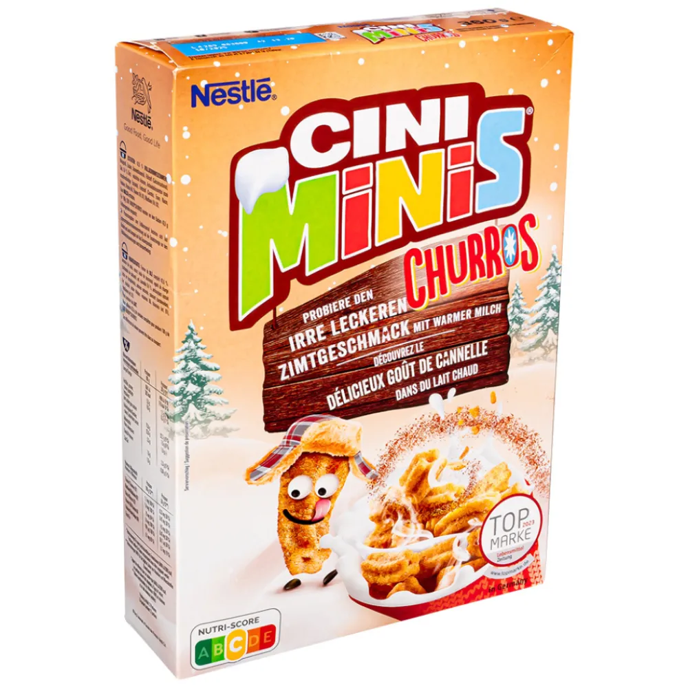Nestlè Cini Minis Churros sono la copia dei deliziosi dolcetti spagnoli, i Churros. Queste frittelline immerse nello zucchero a base di acqua e farina vengono riprodotte sia nella forma che nel gusto dalla Nestlè, il brand per eccellenza per i prodotti da colazione. Tutto il sapore intenso di cannella in questa versione mini e crunchy dei churros.