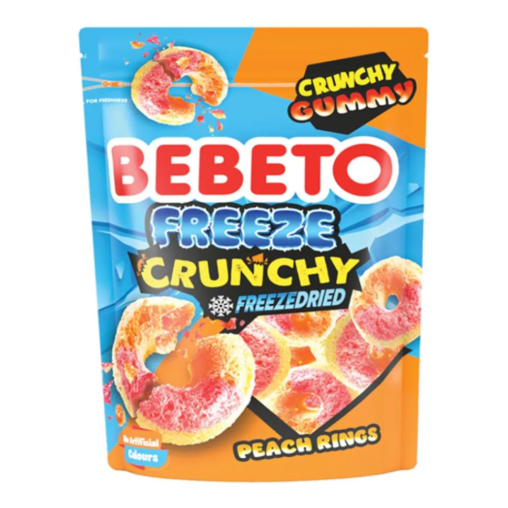 Confezione di Bebeto Freeze Crunchy Gummy Freezedried Peach Rings, deliziose caramelle al gusto di pesca liofilizzate. Queste caramelle combinano la dolcezza succosa della pesca con una consistenza croccante e soddisfacente, garantita dal processo di liofilizzazione. Scopri un’esperienza di gusto unica che rende irresistibilmente croccante ogni gioia di pesca!
