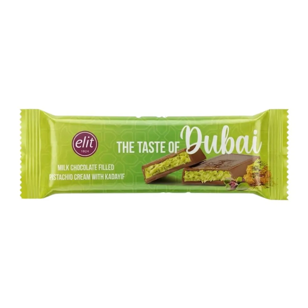 Elit Dubai Chocolate, barretta di cioccolato al latte con crema di pistacchio e Kadayif da 30g su AmericanUncle